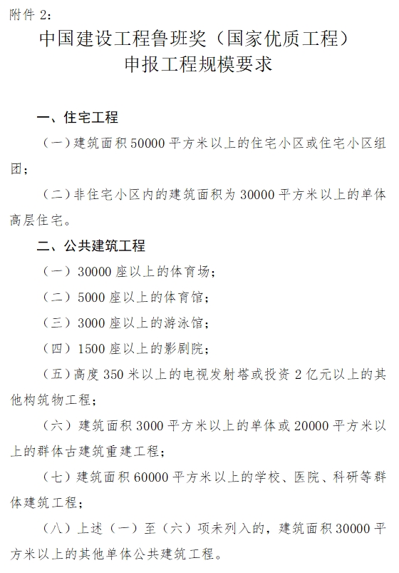 2、中國建設(shè)工程魯班獎(jiǎng)(國家優(yōu)質(zhì)工程)申報(bào)工程規(guī)模要求
