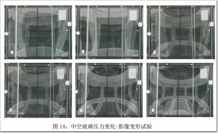 試驗過程利用“玻璃影像專家系統”遠程控制對中空玻璃中空層進行加減壓(圖13 為加壓減壓曲線),并記錄壓力數據,同時對玻璃反射影像進行視頻記錄。試驗過程中觀察到玻璃影像隨氣壓變化發生明顯的變化(如圖14)。值得注意的是試驗項目玻璃配置為 6+12A+6+12A+6 三玻兩腔中空玻璃,由于第三層玻璃的底襯作用,第二層玻璃的反射較為明顯,由于加減壓過程中,第一、第二層玻璃同時產生凸凹相反的變形,因此能同時觀察到放大和縮小兩個影像的變化過程。