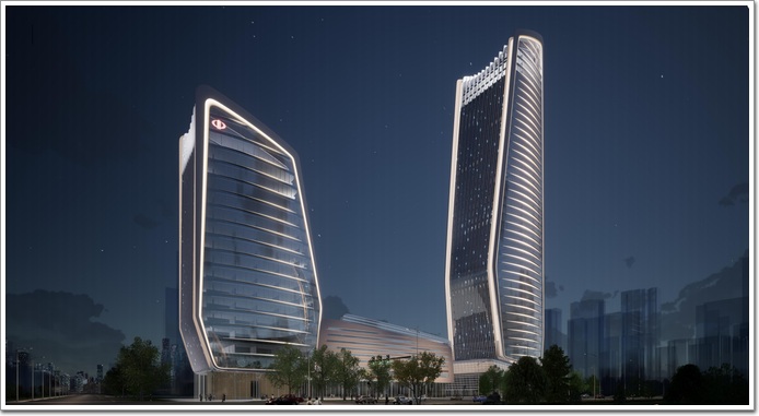 在總體布局上,項(xiàng)目以主副雙塔的組合設(shè)計(jì)提升城市群落空間整體感,延續(xù)城市南偏東的城市肌理,在保證建筑高度曲線的流暢性及連續(xù)性的同時(shí),退讓出入口廣場(chǎng),進(jìn)而保持建筑和城市空間界面適度的開(kāi)與合。