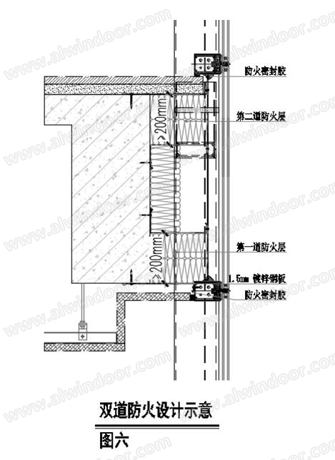 本工程幕墻防火等級為二級, 防火時效不低于1小時。防火巖棉的密度為150Kg/m3,防火層防火巖棉厚度為100mm。層間防火層采用雙道防火措施。防火密封膠密封。