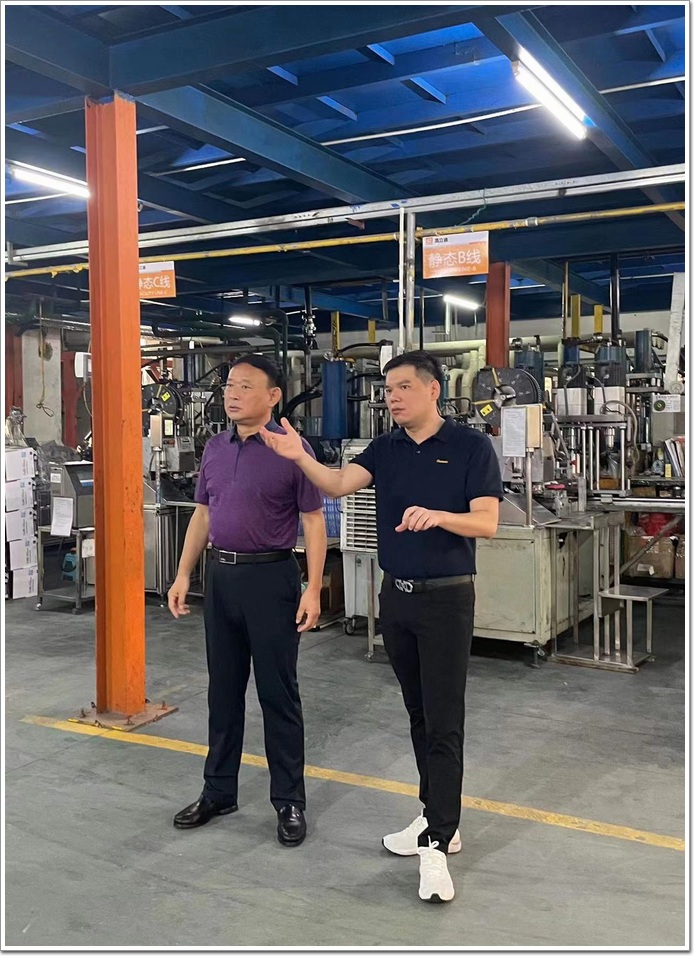李福臣會長一行在葉總帶領下先來到高立德生產車間走訪,查看了生產運營情況,在自動化、智能化、數字化趨勢的影響下,高立德逐步進行生產線的優化與升級,企業自動化程度很高,保證著高效高能、品質如一。