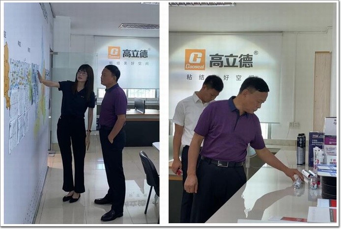 隨后,李福臣會長一行來到高立德的展廳。在葉總等企業領導的帶領與介紹下,協會領導了解了高立德的發展歷程、運營模式、資質榮譽以及網絡布局、發展規劃等,同時,也了解關于公司明星產品防霉膠的檢測以及綠色產品認證情況。在全行業大力倡導綠色高質量發展的當下,高立德與時俱進、緊隨市場變化與需求,敢于突破、不懈精進,嬴得了李會長一行的肯定與好評。
