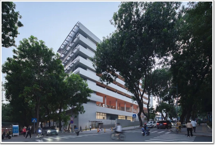 荔園外國語小學景田校區選址于于深圳市中心福田區核心地帶,周圍樓宇密布,場地上原有一片茂密的樹林。項目水平向設置的公共平臺、跑道、連廊與垂直向分布的體育、交通空間系統并置、連接,構成一個完整的立體校園活動空間系統。
