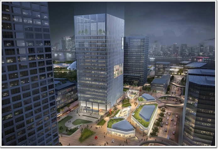 上海西岸傳媒港·諾布中心由120米高的塔樓和三棟獨棟商業(yè)組成,其塔樓建筑設計頗具特色,在金屬質感的方正建筑體上鑲嵌著三個晶瑩剔透的超大空間體,這是塔樓的大堂和兩個公共中庭。