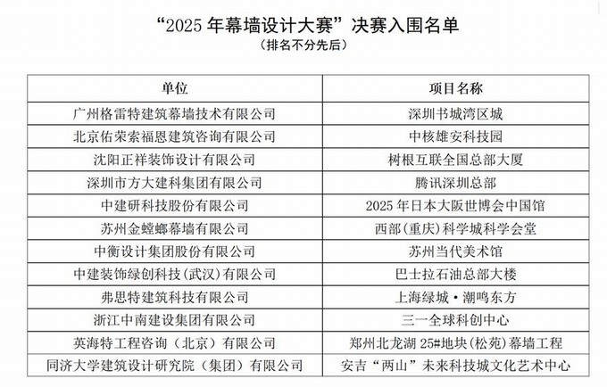 中國建筑金屬結(jié)構(gòu)協(xié)會幕墻設(shè)計(jì)及顧問咨詢分會“2025年幕墻設(shè)計(jì)大賽”活動啟動以來,得到了行業(yè)的廣泛關(guān)注。自2025年7月18日開始,至9月18日17時止,分會共收到到20家企業(yè)共27個項(xiàng)目的申報(bào)。經(jīng)本屆“幕墻設(shè)計(jì)大賽”評選專家初審,共評選出12個項(xiàng)目入圍決賽,現(xiàn)將入圍名單予以公布:
