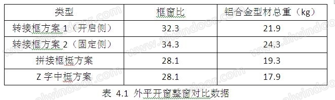 通過結構類型、結構設計組合、結構設計組合加工、外平開窗安裝綜合分析可得。四種方案優缺點明顯。拼接框梃與Z字中梃產品方案的應用可以提高材料的利用率,并且減小外平開窗開啟側與固定側中間轉換尺寸,提升采光通透性。但缺點就是加工工藝復雜且不可控,容易影響整窗產品性能。采用轉接框方案雖然一定程度上造成材料使用以及看面尺寸的增加,但可以有效保證整窗性能,簡化加工工藝。所以根據實際情況應用選擇不同的外平開窗結構類型以對應不同的產品需求才是正確的選擇。