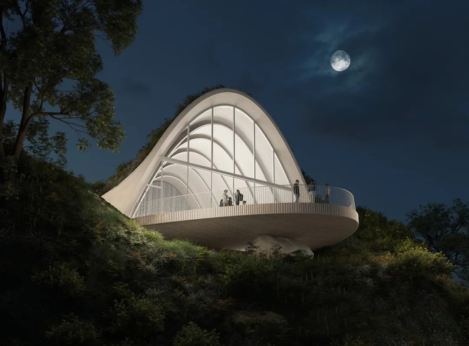 蒲江觀景臺坐落在成都南部的山丘上,既是游客的目的地,也是活動場所,充分利用了華中地區壯觀的自然美景。觀景臺采用流線的拱形,意在融入周圍的自然環境,同時從下面的平原上看,它又宛若一座燈塔,引人注目。土木拱門的結構呈伸縮形狀,吸引游客來到懸挑在斜坡上的寬闊觀景窗和平臺。