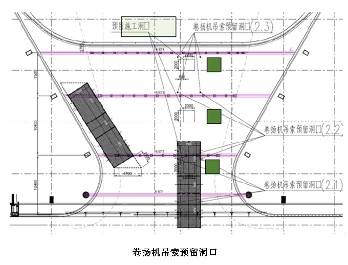 整個系統設置4條平臺軌道,3臺移動工作平臺,8個卷揚機吊繩點,每臺工作平臺設4個提升點。平臺提升位設置于中間位置(見下圖)。