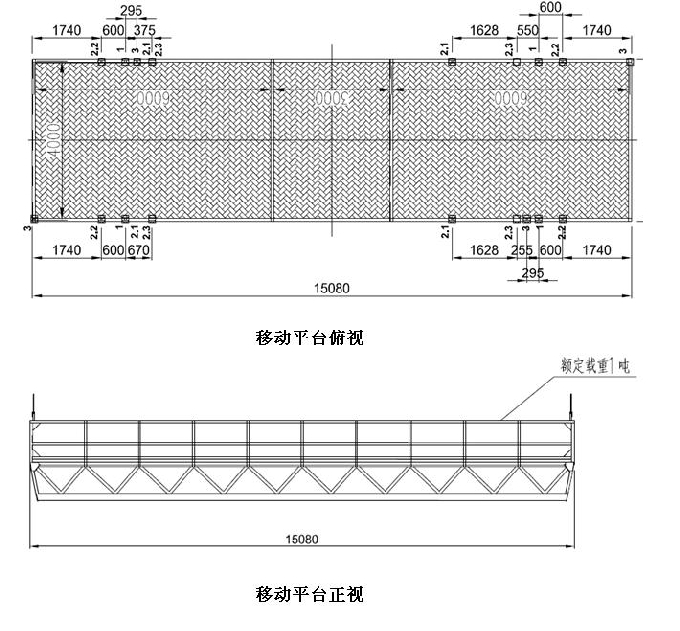 移動平臺尺寸4000mm*15080mm,可拆解中間段3米,平臺尺寸為4000mm*12080mm。見下圖。利用卷揚機將工作平臺提升至吊頂區域。卷揚機安裝于主體結構上,平臺提升過程中設置纜風繩保護,待提升完畢后拆除纜風繩。平臺提升至預定位置后,將平臺通過焊接固結于拉鏈跑車上,焊接并復核確認受力后,移去卷揚機提升繩。