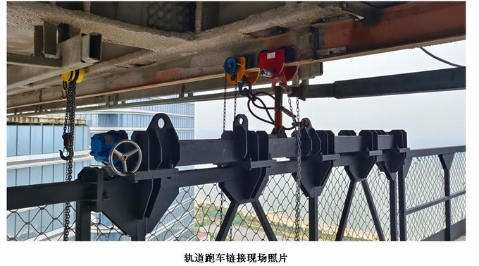 平臺與軌道的鏈接通過3T的拉鏈軌道跑車進行鏈接,每個鏈接點采用2個軌道跑車進行鏈接,其中一個跑車通過3T手拉葫蘆與平臺進行鏈接,平臺調整平整到位后,再用第二個軌道跑車通過100*100*8的方管與平臺可靠鏈接,防止平臺晃動。