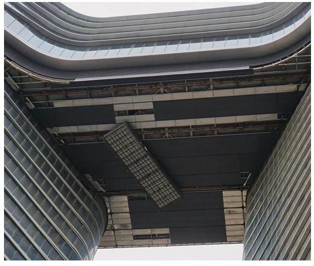 從現場實際情況來看,該系統位于T3連廊底部,標高約134.8M(30F)。吊頂鋁板采用開放式,室外氟碳噴涂處理的3mm鋁板豎縫縫寬4mm,橫縫縫寬4mm,內部有2mm厚銀白氧化的鋁板作防水,因總包連廊整體提升,吊頂分2階段施工,連廊整體提升前施工提升區域龍骨,吊頂提升完成后施工剩余部分。