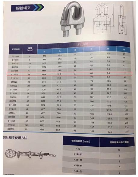 鋼絲繩繩夾:S11016 每根鋼絲繩至少配3個。8套卷揚機設備,至少配24個。
