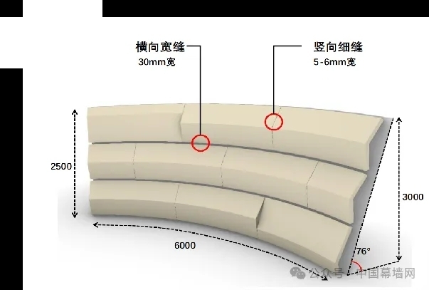 以三星堆新館幕墻為例:選用80mm厚度米黃色石材,通過手工鑿毛處理,曲面折板弧形的石材造型,單塊最大分格1.7平方,在施工過程中3-4塊組裝一個單元,單元重量300公斤,讓幕墻視覺效果更加凸顯,采用分格開縫錯縫布置。