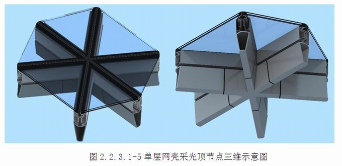 單層網殼采光頂為空間雙曲面造型,采用雙面鋁單板與玻璃間隔布置的形式,鋼結構桿件為150x70x250x10mm厚熱軋梯形鋼龍骨;12mm厚鋼板焊接中心件,中心件采用鑄鋼件,四周采用150x70x250x10mm厚熱軋梯形鋼龍骨,鋼件與鋼件及龍骨之間采用坡口等強連接。支座(詞條“支座”由行業大百科提供)鋼件與鋁合金底座連接,可調節鋁合金底座的高低,定位后通過螺釘擰緊固定;支撐輔助型材通過鋁合金壓塊固定在底座上,支撐輔助型材與鋁合金邊框連接一端設置有球頭構造,鋁合金邊框設置有凹槽構造,球頭嵌入凹槽里面,可調節采光頂面板的角度。(2.2.3.1-3~5)
