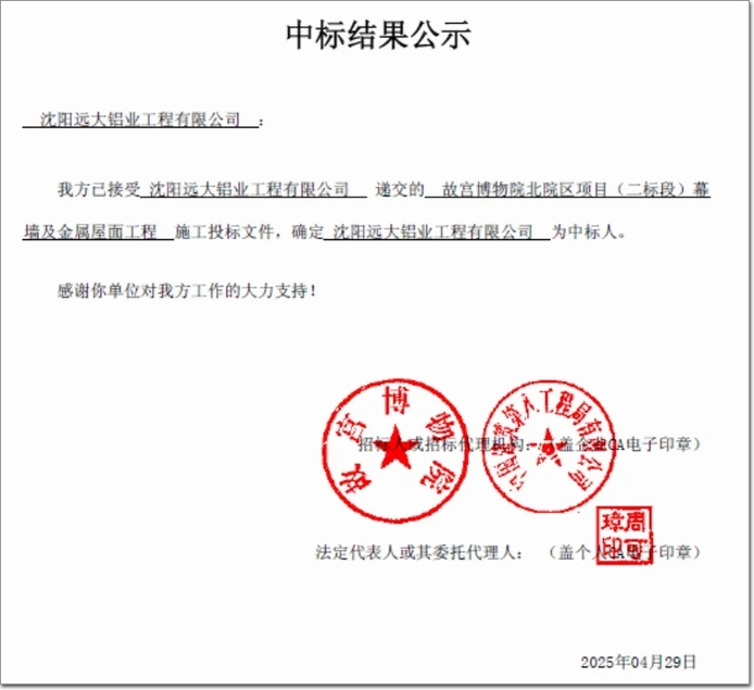 近日,沈陽遠大鋁業(yè)工程有限公司(以下簡稱沈陽遠大)中標(biāo)故宮博物院北院區(qū)幕墻及金屬屋面工程項目。